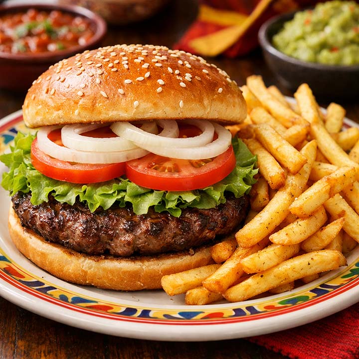 1/3 lb. Broiled hamburger (pre-cooked weight) served with crisp lettuce, sliced tomato and onion. Served with a heaping portion of golden french fries.