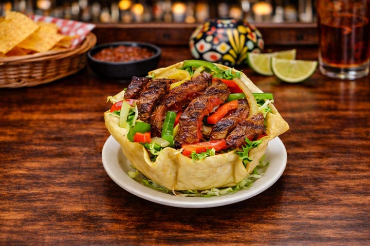 Steak Fajitas sautéed with bell peppers and Spanish onions. Served on a bed of chopped lettuce, with tomatoes and shredded cheese.