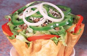 Chicken Fajitas sautéed with bell peppers and Spanish onions. Served on a bed of chopped lettuce, wth tomatoes and shredded cheese.